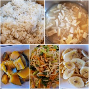 ☆玄米入りご飯☆えのきと油揚げの味噌汁☆南瓜の煮物☆小松菜ともやしのお浸し☆バナナチップ