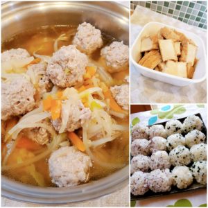 具だくさん肉団子スープ 彩りおにぎり 厚揚げの煮物