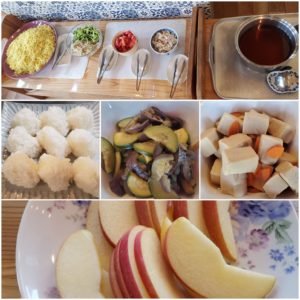 ☆冷やし中華(鶏肉、トマト、キュウリ、もやし)☆おにぎり☆茄子とズッキーニのソテー☆高野豆腐の煮物☆りんご