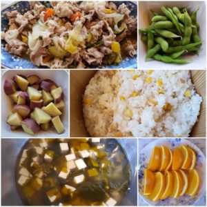 ☆コーンご飯☆豚肉と夏野菜炒め☆豆腐とわかめの澄まし汁☆蒸かしさつま芋☆枝豆☆オレンジ