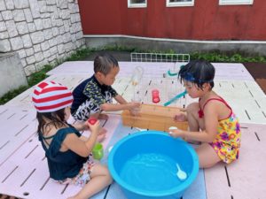 大きい子達はミニトマトの様子をこまめに見に行っています。様子を見た後はそれぞれの観察ノートに記録をつけていつでも見返せるようにしています。数字や文字を見たり教えてもらいながら自分で書く事に意欲的です!生活の中で自然に文字や数字を身に付けている子ども達です✨