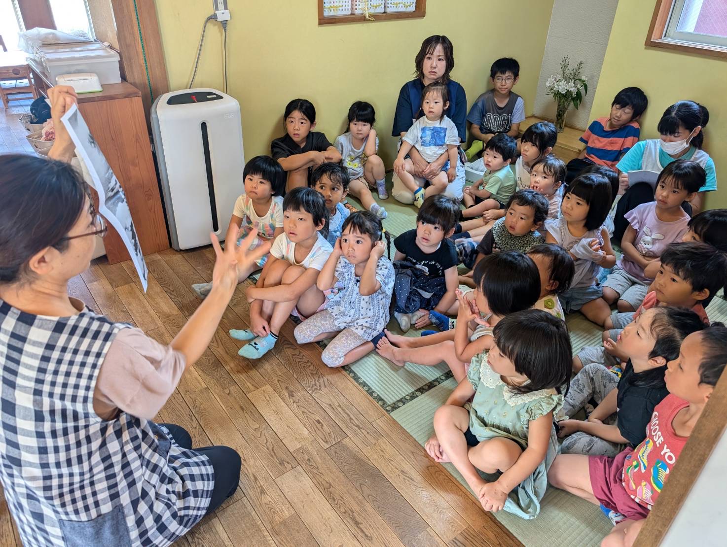 そんな恐ろしい〝戦争〟が、日本でも起こっていたのだと。小さい子から大きい子まで理解の差はあると思いますが、真剣に話を聞いていた子ども達です。「他の国の人達ともみんな仲良くする」「爆発しない。ごめんねする。」「みんなにも戦争はダメって伝える」と、小さな心で一生懸命に考えていました。今も尚、戦争によって苦しんでる人達がいます。どうしたら戦争のない平和な世界になるのだろうか…日々子ども達と向き合い考えていきたいと思います。