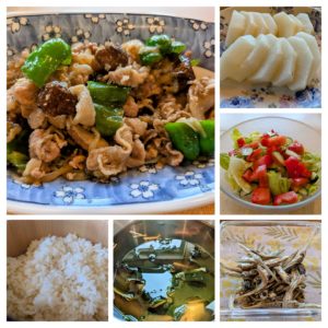 ☆豚肉と茄子味噌炒め☆玄米入りご飯☆えのきの澄まし汁☆野菜サラダ☆小魚☆梨