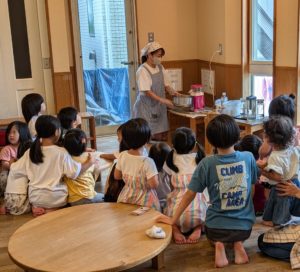 ポップコーンが出来る様子に興味津々の子ども達!!出来立てのポップコーンをみんなで頂きました♪おいしかったね!!