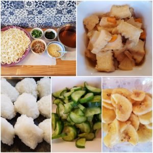 ☆夏野菜と肉味噌冷やしうどん☆おにぎり☆厚揚げの煮物☆胡瓜の浅漬け☆バナナチップ
