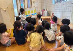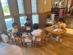 おやつの後、お部屋のお掃除を済ませたプロジェクトチームのみんなは振り返りと次の日の掃除の場所を確認しておしまいにしています。「おやつを食べるのが早かったからお掃除も早く終わった」と、いう意見が出ていました。時間の使い方も日々の生活の中で学んでいる所です!