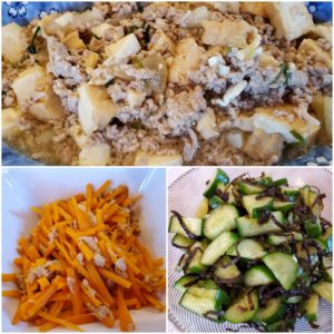 ☆厚揚げのそぼろ煮☆人参しりしり☆胡瓜と塩昆布和え☆もずくと豆腐の味噌汁☆玄米入りご飯/白米☆バナナチップ