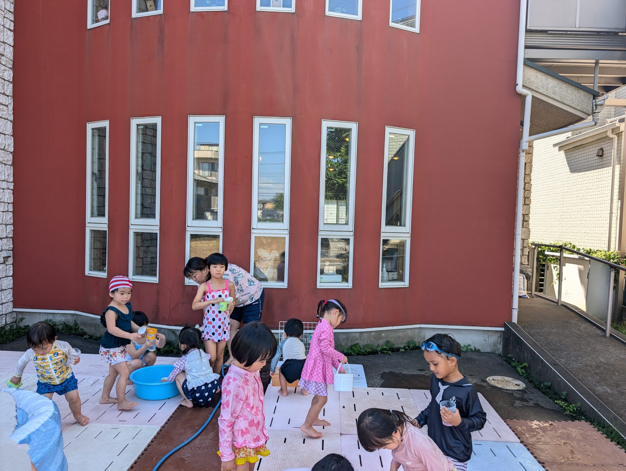 子ども達は水遊びをして楽しみました♪もう少し水遊びが楽しめそうです😊