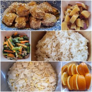 ☆豆腐ハンバーグ☆玄米入りご飯☆えのきとコーンのスープ☆さつま芋の煮物☆小松菜ときのこの炒め物☆オレンジ