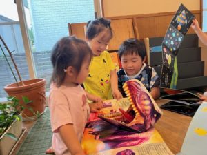 お部屋遊びでは絵本の入れ替えをしました。飛び出す絵本が人気でした♪