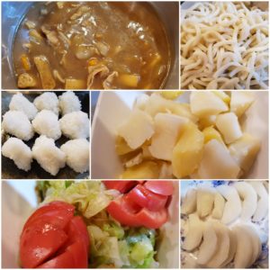 ☆カレーうどん☆おにぎり(白米)☆蒸かしじゃが芋☆トマトとキャベツのサラダ☆梨