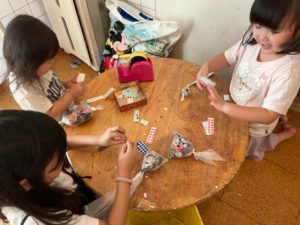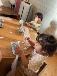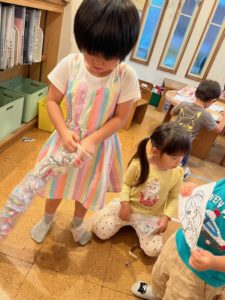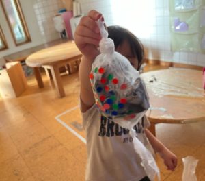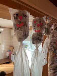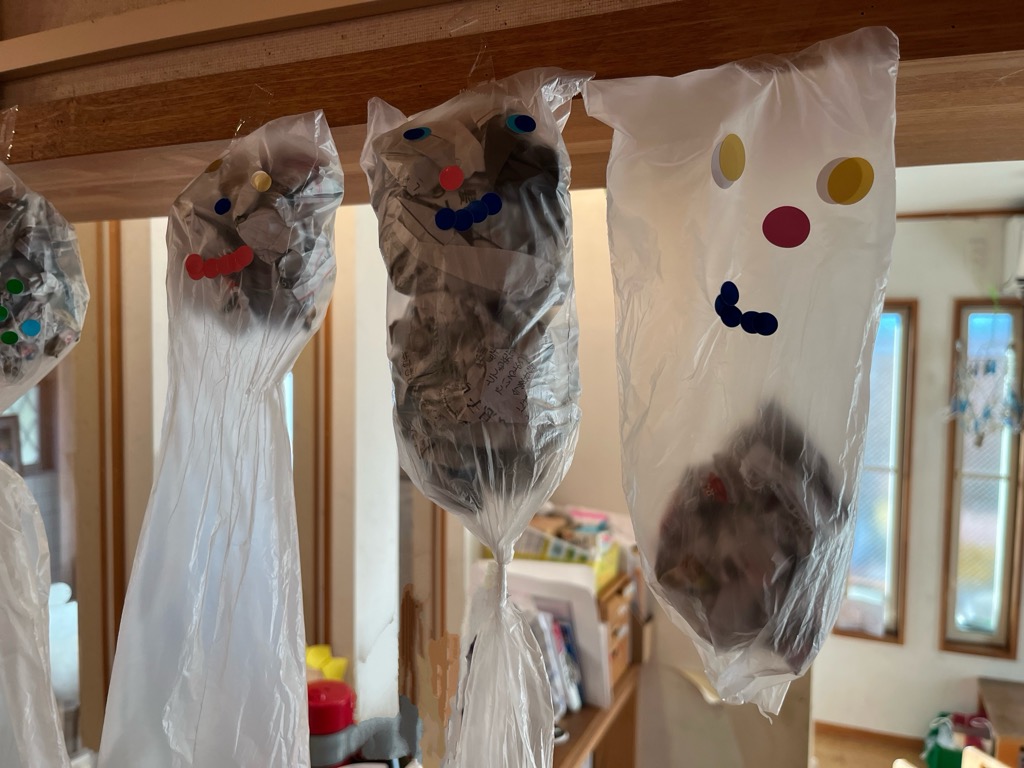 てるてる坊主を作ろう!と提案があり、余っていた傘袋を使っててるてる坊主を作って遊びました😊