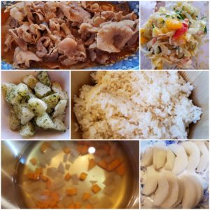 ☆ポークケチャップ☆玄米入りご飯☆根菜スープ☆みかんサラダ☆のり塩ポテト☆梨