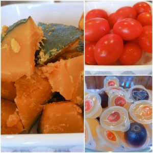 南瓜の煮物 ミニトマト 果物(プチゼリー)