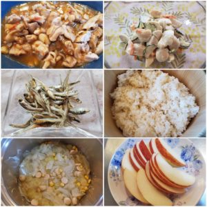 ☆鶏肉のトマト煮☆里芋のサラダ☆小魚☆玄米入りご飯☆キャベツのスープ☆りんご