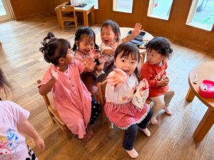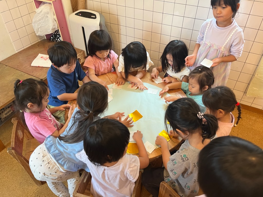 来週のお月見会を楽しむために子ども達と相談して、大きなお月様やウサギを作って飾る事にしました。