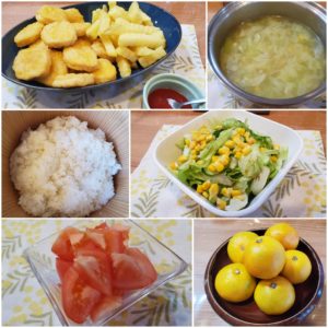 ☆チキンナゲット&ポテトフライ☆ご飯☆キャベツのスープ☆野菜サラダ☆トマト☆みかん