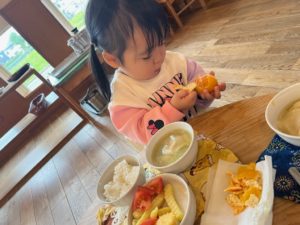 みかんは丸ごと出してみました🍊自分で上手にむいて食べていました(1歳児)