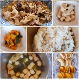 ☆豚肉と茄子の味噌炒め☆玄米入りご飯☆お麩の澄まし汁☆高野豆腐の煮物☆蒸かし南瓜☆オレンジ&りんご