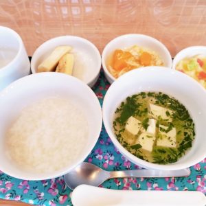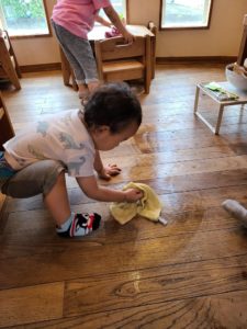 ⇧ランチルームにて。スープが好きな1歳児の男の子。お椀にスープをよそい自分の席まで慎重に慎重に運びますが、途中少しこぼしてしまいました。用意されている雑巾でこぼした所を自分で拭いて始末することを日々学んでいます。