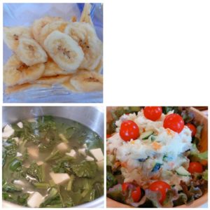 ほうれん草と豆腐のスープ ポテトサラダ バナナチップ