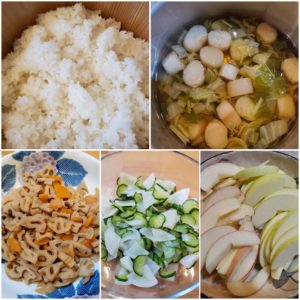 ☆ご飯☆白菜とお麩の澄まし汁☆蓮根と人参の金平☆蕪と胡瓜の浅漬け☆りんご