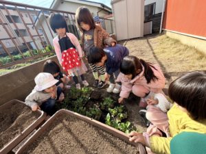 公園から帰ってきたら大きい子達は畑を見に行きました😊日々の小さな成長を喜び合っていた子ども達です♪