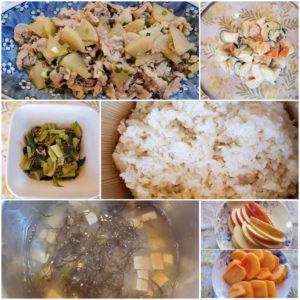 ☆豚バラ大根☆玄米入りご飯☆もずくの味噌汁☆里芋サラダ☆小松菜ツナ炒め☆柿&りんご