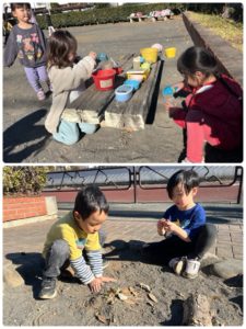 今ブームの氷おにごっこやだるまさんが転んだ、自然物を使ってお料理やバーベキューごっこ、人魚姫ごっこなど、色々楽しい遊びを考えて楽しんでいました♪