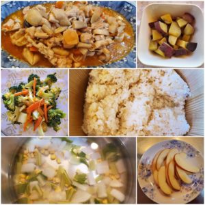 ☆冬野菜とチキンのトマト煮☆玄米入りご飯☆大根とコーンのスープ☆蒸かしさつま芋☆ブロッコリーサラダ☆りんご