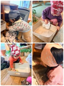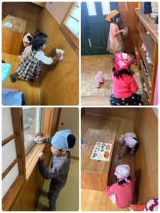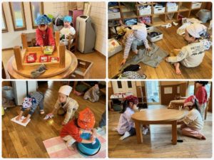 大きい子達は窓の桟や壁、棚の裏などの汚れに気付き考えながらお部屋をきれいにしていました😃