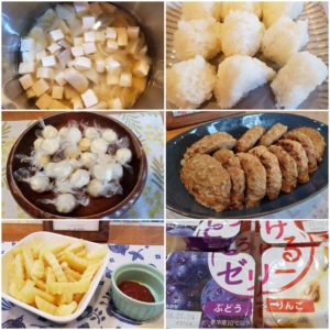 ☆ほかほかおにぎり☆大根と高野豆腐の味噌汁☆ハンバーグ☆ポテトフライ☆チーズ☆ゼリー