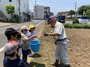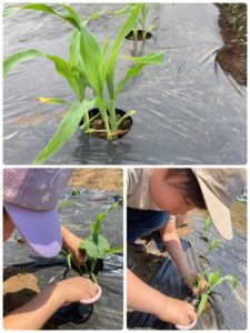 大きい子達が育てているじゃが芋とトウモロコシは、太陽の日差しをうけ、元気に大きくなっています。今日はトウモロコシの手入れに行きました。2粒づつ撒いた種から芽が伸び、間引きの時期です。大きい方の芽を残して小さい方は根を傷めないようにハサミで切ってあげました。どっちを残すかを慎重に見極めながら丁寧に手入れをしてくれました。