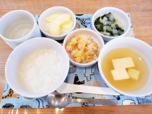 5倍粥 豆腐の味噌汁 野菜たっぷり鮭のだし煮 ほうれん草と大根のトロトロ りんご