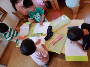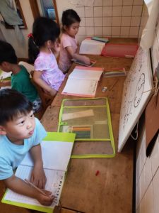 暑さも厳しかったので先に部屋に戻らせてもらった年中さん達は、自分たちから記録ノートを付け始めていました。ボードを見ながら一生懸命日付を書いたりしています。