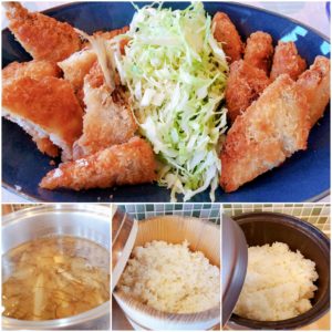 魚フライ(白身魚、アジ) 玄米入りご飯 白米 もずくと豆腐の味噌汁