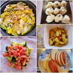 ☆ミルフィーユ鍋☆わかめおにぎり☆ポテトカレー炒め☆ブロッコリーとトマトのサラダ☆りんご