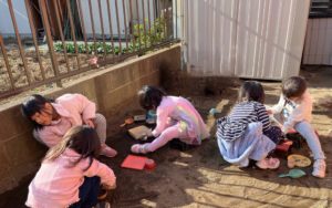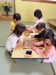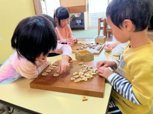 将棋に興味を持って自分から〝やってみたい〟と思い、入部をしてくれたお友達に、年長さんが優しく教えてあげながらみんなで駒の名前と並べ方をおさらいしました。