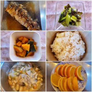 ☆鯖の照り焼き☆玄米入りご飯/白米☆根菜の味噌汁☆ふかし南瓜☆小松菜のり和え☆伊予柑&はっさく