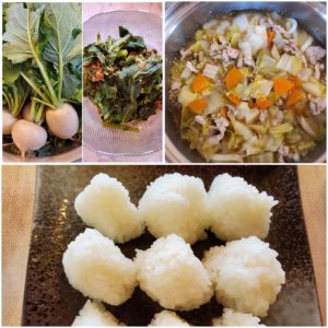 ☆冬野菜の煮込みうどん☆塩おにぎり☆かぶの葉の炒め物