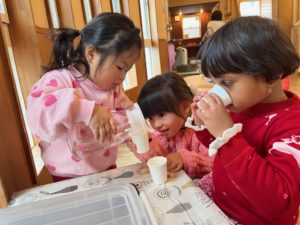 お部屋にはいつでも自由に水分補給が出来る水飲みコーナーを用意しています。お友達と一緒にティータイムです♪