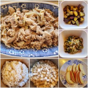 ☆豚肉の味噌生姜焼き☆玄米入りご飯/白米☆豆腐と油揚げの澄まし汁☆蒸かしさつま芋☆小松菜ともやしの和え物☆りんご