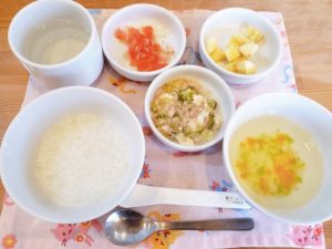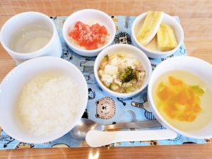 【後期】☆五倍粥☆野菜たっぷりスープ☆ブロッコリーとツナの豆腐餡かけ☆トマトおかか和え☆バナナ