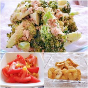 ☆ツナとブロッコリーの胡麻和え☆トマトのサラダ☆バナナチップ