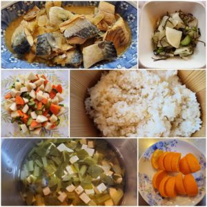 ☆鯖の味噌煮☆玄米入りご飯/白米☆豆腐と小松菜の澄まし汁☆里芋サラダ☆大根の塩昆布和え☆オレンジ
