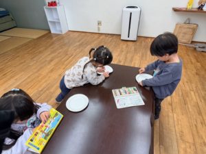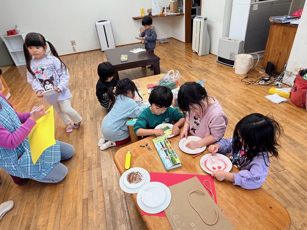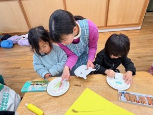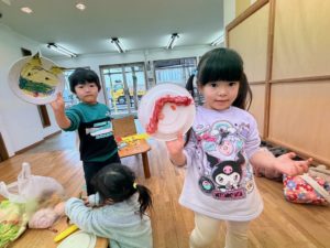 今日のアトリエの日(3歳児)は、紙皿を使ってお面作りを楽しみました♪