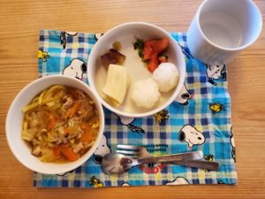 【完了期】☆野菜たっぷり醤油ラーメン(卵不使用麵)☆ころころおにぎり☆豆苗とトマトのナムル☆さつま芋煮☆バナナ