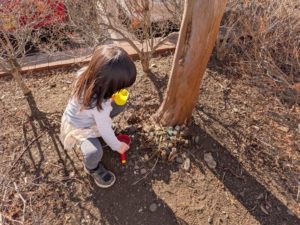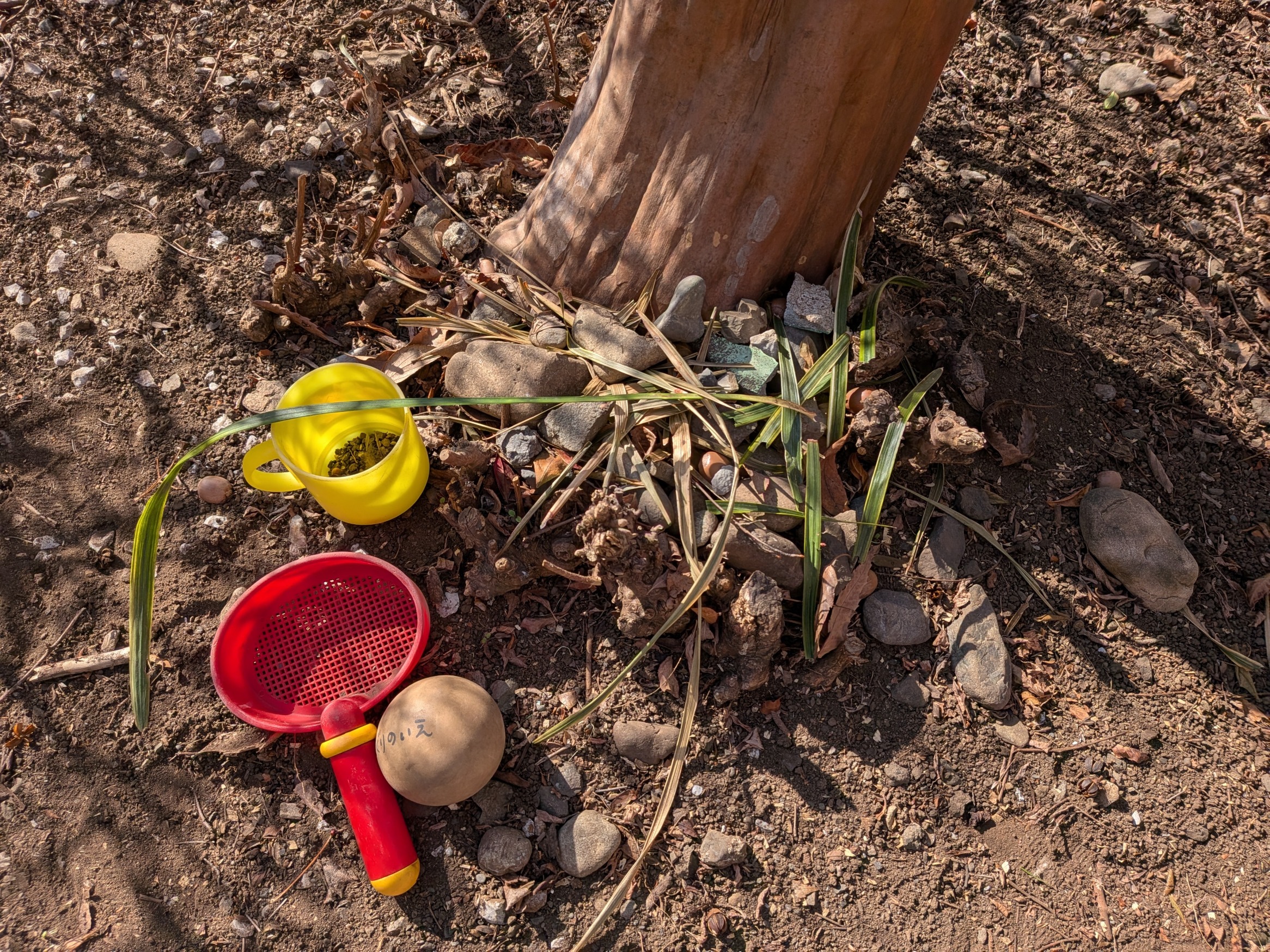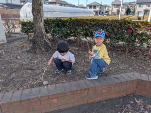 今日はぼうけんフレンディーでお泊まりをしていた年長さんを見送ったあとぞうさん公園に行きました♪上着がいらないようなポカポカ陽気の中のんびりと楽しんでいた子ども達です♪おうちごっこで使う材料を秘密の場所に集めていた女の子・・・