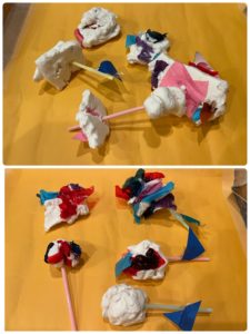 今日の0.1.2歳児のアトリエの日は、ストローを使って紙粘土に色紙やカラーセロファンの切れ端を差し込んでみました。