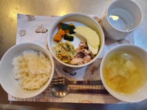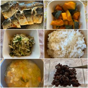 ☆鯖の照り焼き☆玄米入りご飯/白米☆白菜と油揚げの味噌汁☆蒸かし南瓜☆切干大根とほうれんそうのサラダ☆レーズン